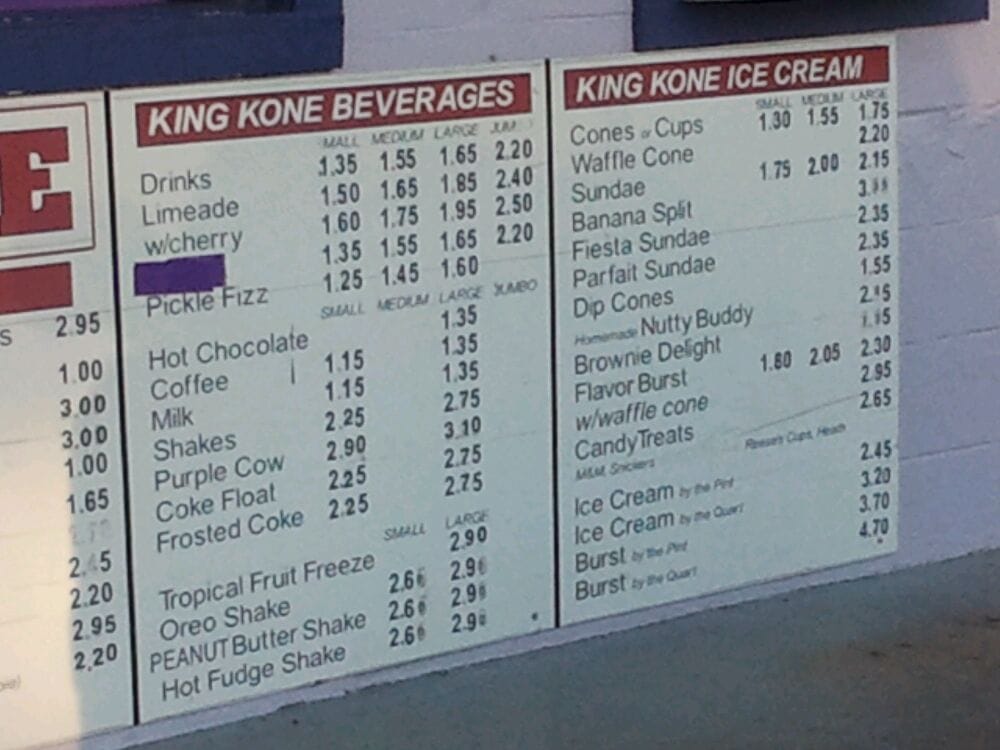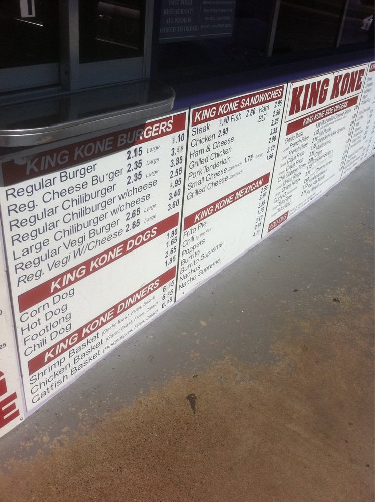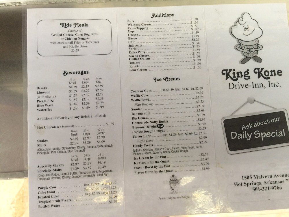 King Kone in Hot Springs, AR offers a range of fast food and American-style desserts. With options like takeout, delivery, outdoor seating, and catering available, King Kone caters to various preferences. The menu features side orders like fries, onion rings, and mozzarella cheese sticks, alongside kids' meals and additions like whipped cream and extra patties. Customers rave about the turkey burgers, shakes, cheeseburgers, and soft-serve ice cream. The generous portion sizes and quality service are highlighted by customers who appreciate the nostalgic feel of this establishment. King Kone is a must-visit for those craving classic comfort food and delicious sweet treats in a friendly atmosphere.